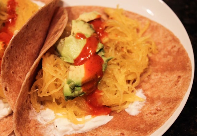 As I said, I’ve been making spaghetti squash so much this winter. My applications have been both basic (see spaghetti squash and meatballs on the left) and quirky (see spaghetti squash in tacos on the right).