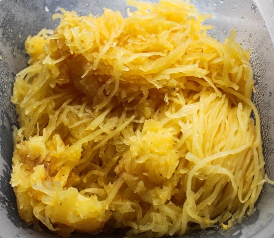 When the spaghetti squash is done roasting, let it cool for 10 minutes. Once it has cooled begin to pull the flesh away from the skin using a fork. Here you will discover the wonders of the spaghetti squash!