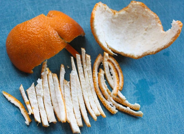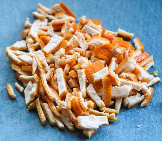 Start by peeling the clementines. Reserve 1/4 cup of pith-free clementine peels (or as close to pith-free as you can get). Slice the peel into thin strips then chop into small pieces. Including the peel helps increase the deep clementine flavor in this marmalade. But, if it’s not your jam (PUN INTENDED), then you can skip it.