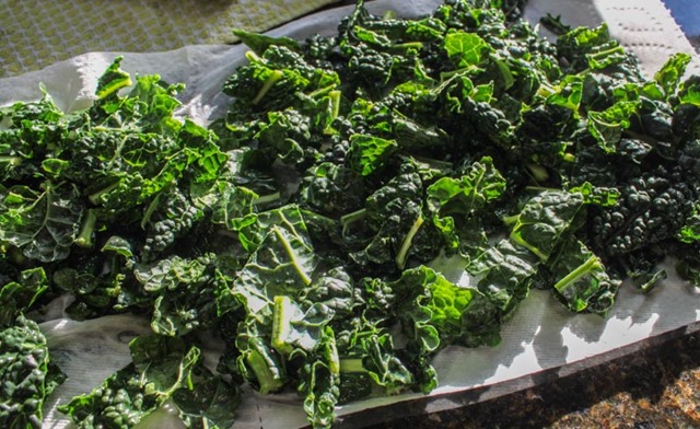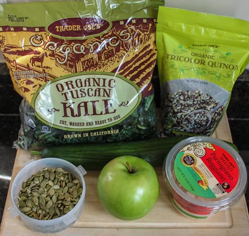 While the quinoa is cooking, prep the kale. For this recipe (and for most recipes these days) I am massaging my kale. I started first by rinsing and trimming my kale. I found this lovely bagged organic tuscan kale at Trader Joe’s but it has some thick stems I wanted to remove before massaging. After trimming I put the kale in a big bowl with a teaspoon of EVOO, pinch of salt, and massaged for 5 minutes.