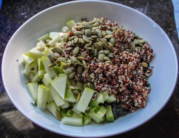 I tried out a few different salad dressings (greek, caesar, honey mustard) to see which jived the best with this flavor combination. In the end I opted for a quick balsamic and EVOO combination, nothing fancy at all. I think the balsamic vinegar played nicely with the tart apple and earthy kale.