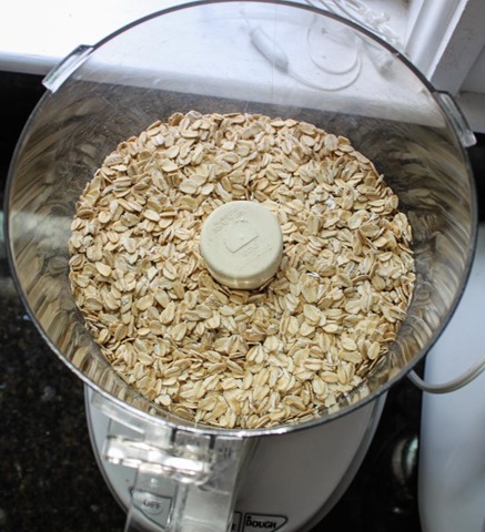 Start by making oat flour with 2 cups of the oats in a food processor. Pulse until the oats are ground into a fine flour.