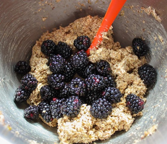 When the dough has come together, gently hand-stir in the blackberries. Reserve a handful of blackberries for the next step.