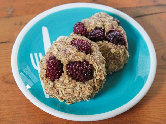 Form 10 equal sized cookie dough balls with your hands (wetting your hands with water first with prevent sticking!) and place them on a parchment paper lined baking sheet. Press 2-3 blackberries into the top of each dough ball. Make sure to flatten the cookies a little with your hands; they won’t flatten while baking (because there’s no butter!).