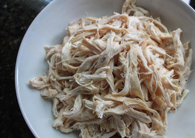 Start by baking the chicken – rub down with EVOO, salt, and pepper first – at 350 degrees for 25-30 minutes or until your meat thermometer reads 165 degrees. Truthfully, we only cook meat now according to temperature, and not time. It’s much juicier and tender that way. When the chicken is done, remove from the oven and cool to room temperature. When the chicken has cooled, shred it up with two forks for perfect pulled chicken.