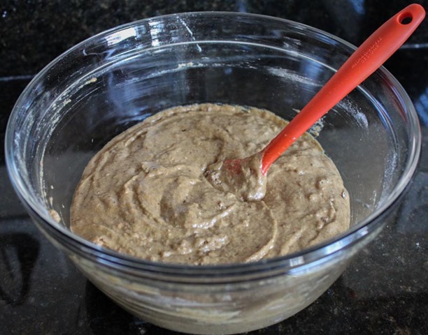 First mix the dry ingredients together in a big bowl, then add in the wet ingredients, and stir until the batter fully comes together.