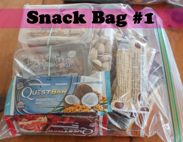 Snack Bag #1 holds all of the heavier items like nuts, protein bars, and our Graze box packs. I keep these items separate from pretzels and crackers because they would just crush them all.