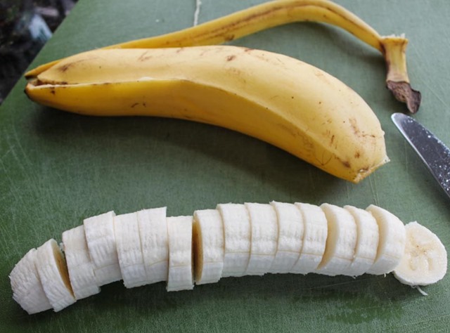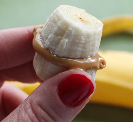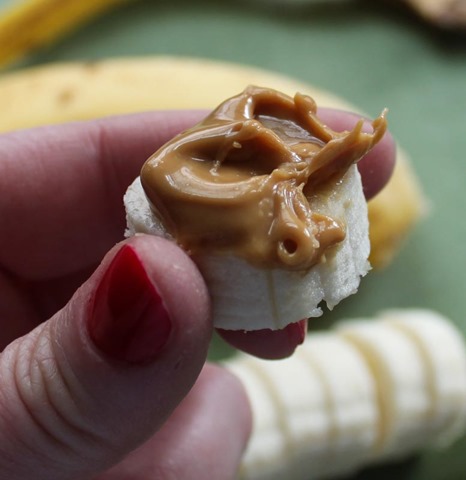 Slice the banana into an even number of pieces (mine yielded 15 1/3 in” slices). Take one banana slice and smear with peanut butter (up to you how much but don’t over stuff it!). Place another banana slice on top like a sandwich.