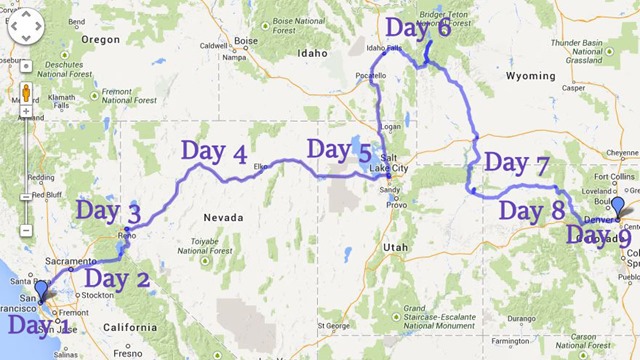 In May 2014 we drove 1,950 miles through 6 different states (California, Nevada, Utah, Idaho, Wyoming, and Colorado). We went to 5 national parks/landmarks, went to 4 museums, took 2 factory tours, rode a train through the Rockies, went on a boat cruise of Lake Tahoe, took a walking tour of San Fran, hiked the tallest peak in Salt Lake City, saw real dinosaur bones in Colorado, survived the highest altitude we’ve ever been at (11K feet), ate countless memorable meals, and had one Guy Fieri sighting. Check out our route: