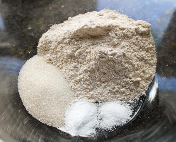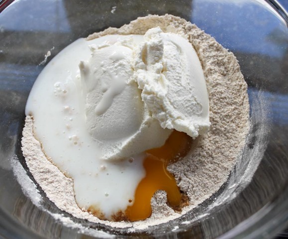 First mix the dry ingredients together in a big bowl, then add in the wet ingredients (minus the egg whites), and stir until the batter fully comes together.