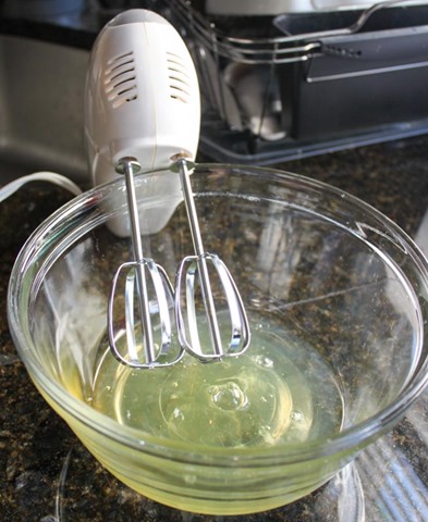 In a separate bowl, beat the egg whites together with a hand mixer until soft peaks have formed.