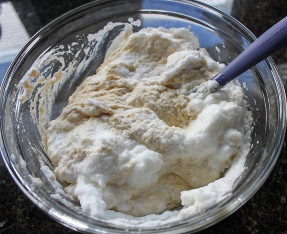 Add the egg whites to the pancake batter and gently fold in until they are fully incorporated. Don’t stir here, you really need to use a careful folding technique so that the egg whites stay intact.