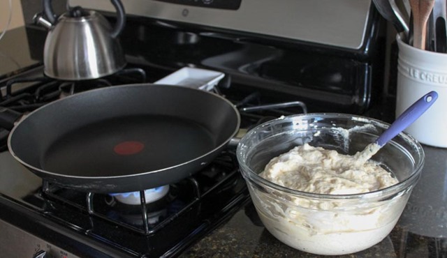 For the most efficient and least messy pancake making situation, set up an assembly line of a hot pan, pancake batter, and non-stick spray right next to the stove.