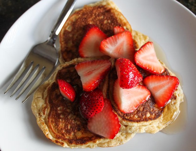 Pre-heat a large skillet or saute pan over medium heat for a few minutes. When the pan is hot, spray with cooking spray and carefully spoon on the pancake batter. I would recommend small pancakes here – roughly two tablespoons of dough. They don’t spread out so you should flatten them slightly once they’re in the pan. They also don’t form the telltale bubbles like traditional pancakes so keep an eye on them. Each side should cook for about 3-5 minutes or until the center or the pancake is cooked (this will depend on how flat they are/how much batter is in the center).