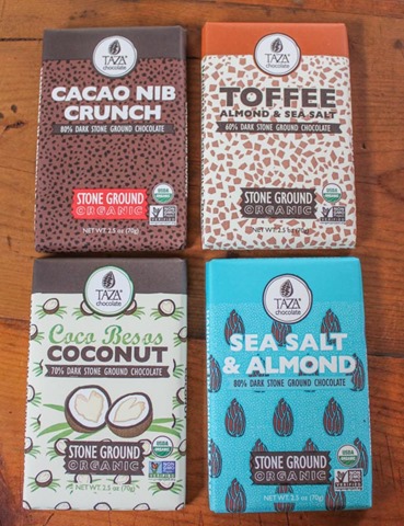 In mid-June Taza launched five new chocolate bars in their Amaze Bars line – Coconut (70% dark), Sea Salt & Almond (80% dark), Cacao Nib Crunch (80% dark), Toffee Almond & Sea Salt (60% dark), and Raspberry Nib Crunch (60% dark though not pictured here, I’m not a raspberry/chocolate fan).