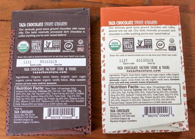 Also, I’m really obsessed with the packaging of this line. Taza really took it up a notch! Bright colors with cute representations of the ingredients, while remaining simple and appealing. I also have to mention another thing I love about Taza and this packaging – each bar includes a batch code (which you can look up on their website to see how it was made) as well as a ‘best by’ date.