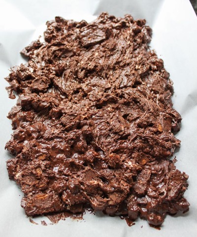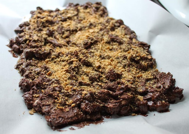 Scoop the mixture out onto a parchment paper lined cookie sheet. Spread out to form an even layer. Sprinkle the graham cracker crumbs over the top and gently press down into the warm chocolate to ensure it sticks. Protip: To make sure you don’t get chocolate everywhere you can wet your hands with cool water and form the bark with your hands, or you can spray a spoon/spatula with cooking spray and do it that way. Same goes for pressing the crumbs down on top too.