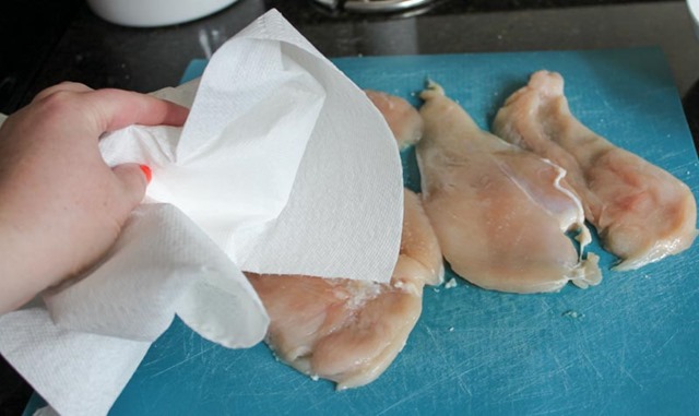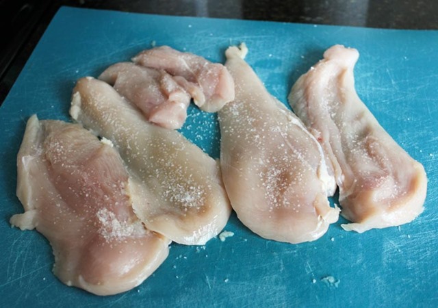 To begin, start by cutting the chicken breasts in half into thin cutlets. Pound until they are uniformly thin (about 1/2 inch). Sprinkle each side of each cutlet with 1/8 teaspoon salt and let stand at room temperature for 20 minutes. After 20 minutes, the chicken will have let off a noticeable amount of moisture. Pat dry with a paper towel – we want nice, dry cutlets so the breading adheres.