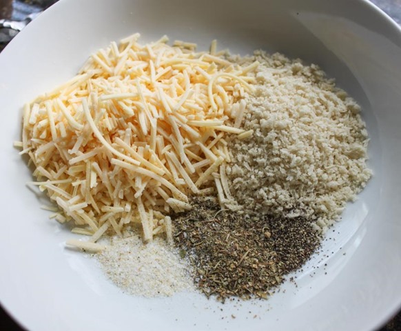 You can also prep the breading situation while you wait too. In one shallow bowl mix the parm cheese, panko, and spices together thoroughly. In another shallow bowl whisk the egg and flour together until it is smooth/there are no lumps.
