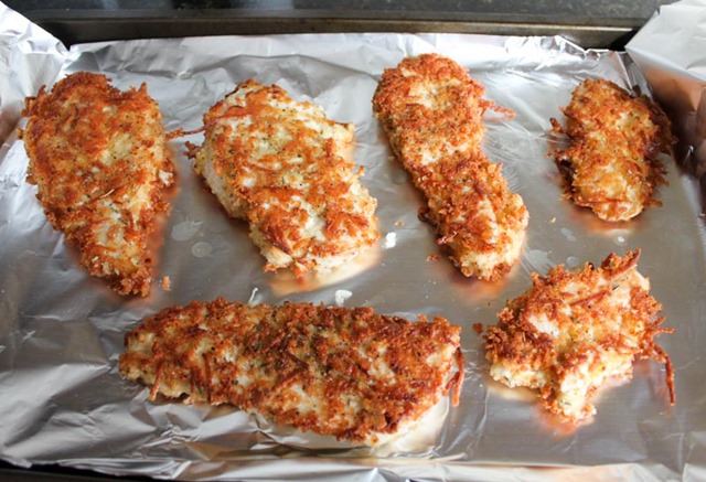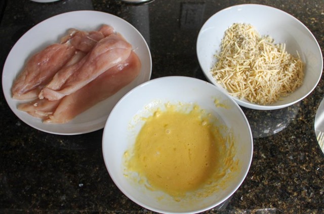 When all of the ingredients are ready to go, form an assembly line – chicken, egg/flour, coating, and plate.