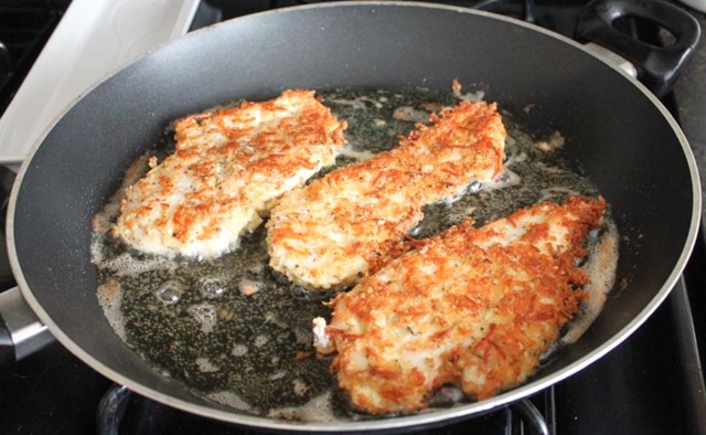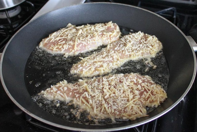 While you’re prepping the chicken, heat the oil in a large skillet over medium high heat. When it begins to shimmer, place half of the chicken cutlets into the oil and fry until brown (about 2-3 minutes per side). Make sure to take the temperature of the chicken to make sure it has cooked through (we’re looking for 165 degrees here). If it’s not done, just leave in the pan and reduce the heat a bit, waiting until it gets to 165. Tool tip: this is my go-to meat thermometer and I love it.