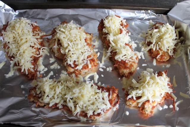 When all of the cutlets have been fried and are cooked through, place them on a broiler safe pan lined with tinfoil, top with the fontina/mozzarella mixture, and broil until the cheese is bubbly and melty.