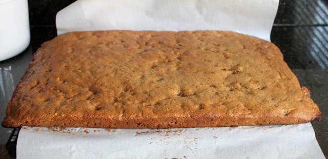 Line an 18×13 baking sheet with parchment paper. Grease the paper and any parts of the pan that are showing. Spread the cake batter evenly out onto the baking sheet. It’s ok if it doesn’t fill the entire pan, it will spread out while baking.