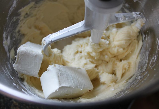 While the cake is cooling, make the frosting (it’s super simple). In a big bowl or stand mixer, mix together all of the ingredients starting with the sugar, butter, vanilla, and salt, and dropping the cream cheese in piece by piece until the frosting is smooth and uniform. This can stay at room temperature until you’re ready to use it.