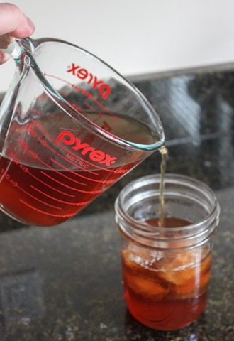 Start by brewing the chai – pour two cups of boiling water over two chai tea bags. I do this in my Pyrex measuring cup so I can stay precise. Add in the sweetener and stir to dissolve. I prefer to cool the tea to room temperature or chill in the fridge before using (a total make ahead). You can use it hot, but you’re going to melt all your ice really quick and possibility dilute the latte.