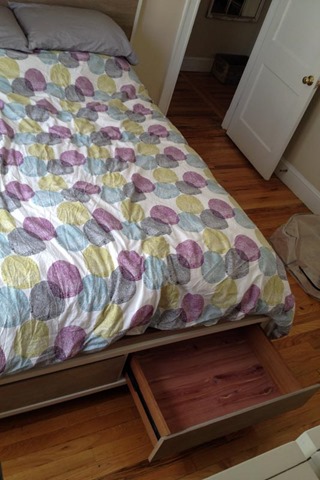 The following weekend, on July 12, 2014, our new bedroom furniture was delivered! Before it arrived though we had to clear out all of the old furniture. The tall dresser went out on the sidewalk, the wide dresser was picked up by my coworker, and the box spring was hurled off the front porch because we couldn’t get it down the front stairs. Amazingly it didn’t break and so we put it in the freecycle pile on the curb along with the dresser and a few other things – and someone took it! (Ew/yay?)