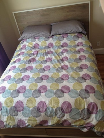 In September 2012 we made our first bedroom purchase – winter bedding! We bought the following at IKEA: the Mysa Ronn down comforter and the Malin Rund duvet cover set. This purchase was a small one (under $100) but it made a huge difference – it brought color and life to a room that was really boring.