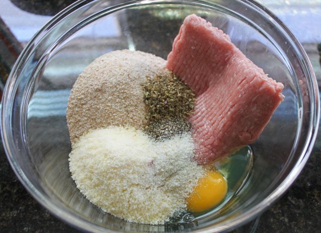 Next, make the meatballs. Combine all of the meatball ingredients in a big bowl and mix until thoroughly combined. Your hands are the best tools for this job! Once mixed, form small, 1 inch meatballs and set aside.