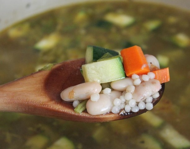After 30 minutes the spinach will have fully wilted, the couscous will have thickened the soup, and the meatballs will be fully cooked. Taste and adjust for seasonings.