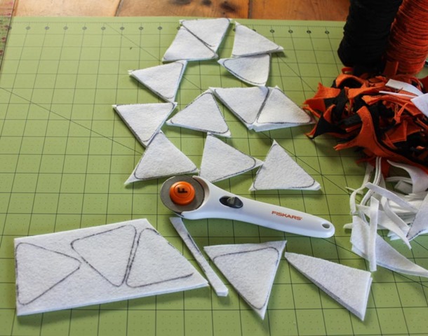 Next I used two pieces of white felt to trace the triangles on, cut straight edges with my straight ruler and rotary cutter, and rounded the edges off with scissors. I ended up with 32 white triangles. I then cut the triangle stencil up to use the pattern for the middle and bottom pieces of the candy corn. I used one piece of orange felt and one piece of yellow felt to cut the candy corn strips. I ended up with 32 orange pieces and 32 yellow pieces.
