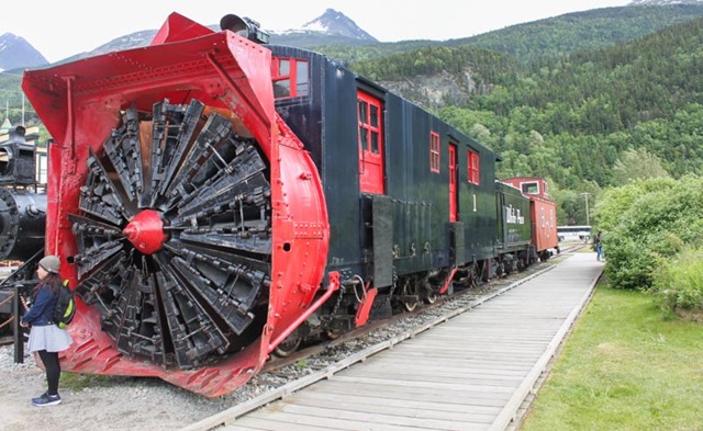 One of the biggest attractions in downtown Skagway is Rotary Snowplow No. 1, seen below. It was used to help clear the train tracks of snow during the harsh winters in Skagway. It is pushed by two helper engines and its 10 blades use centrifugal force to clear the snow (probably could have used one of these in Boston with our 100+ inches of snow this winter). The plow was built in 1898 by the Cooke Locomotive and Machinery Company of Paterson, New Jersey for the White Pass and Yukon Route railroad and was retired in 1965 (cool video of it in action here).