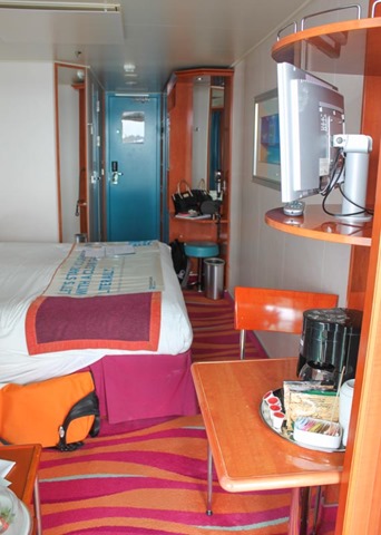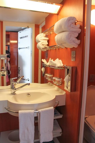John and I opted for the standard state room with a balcony on deck 10. It was roughly 205 sq. ft., with a floor to ceiling sliding glass door to the balcony, modest bathroom, and a sitting area. I thought 200 sq. ft. was going to be way too small for us but it actually worked out perfectly. It was cozy but we weren’t like sardines in there by any means.