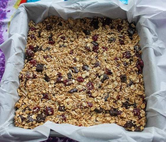 Be sure when stirring that all of the dry ingredients are picked up from the bottom of the bowl and that each piece is coated. Line a square baking pan with parchment paper and spoon the mixture in.
