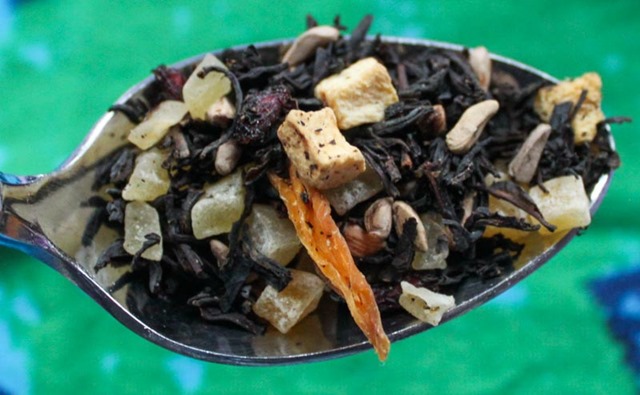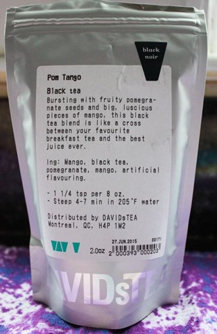 The David’s Tea Pom Tango tea is made of black tea, dried pomegranate, and dried mango. It’s sweet, fruity, luscious, and has a really mellow flavor.