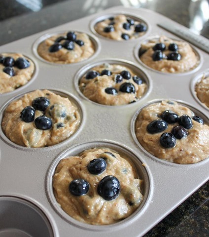 Scoop the dough into a muffin tin that has been sprayed with non-stick spray. Take a few extra blueberries (or reserve some at the outset) and top each muffin with them. Bake at 400 degrees for 15-18 minutes.