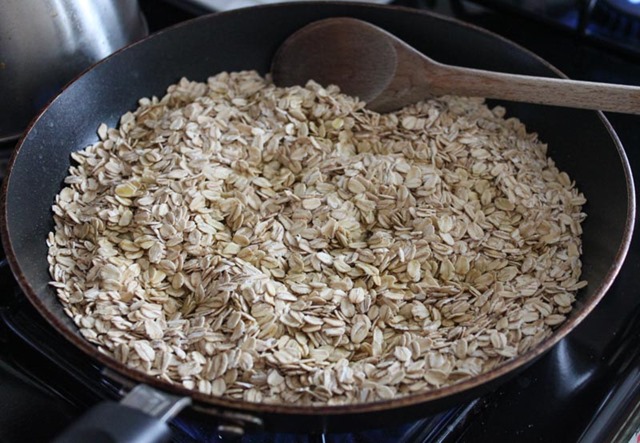On to the muffins! Start by melting 2 tbsp. of butter in a saute pan over medium-low heat. Add the oats and cook until they brown and start to smell like popcorn (7-9 minutes).