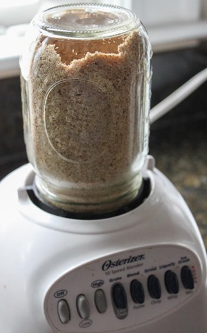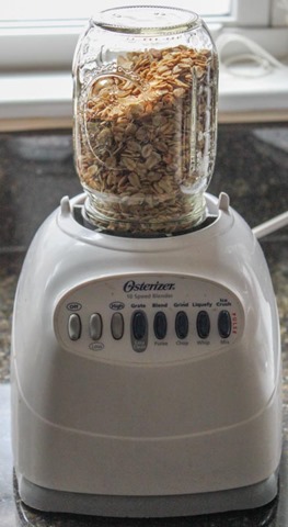 When the oats are done, cool for 10 minutes. When they’ve cooled, process them into oat flour. You can use a food processor, blender, spice grinder – whatever you have! My favorite method of processing oats is to use a mason jar on my blender. Instructions here and pictures below!