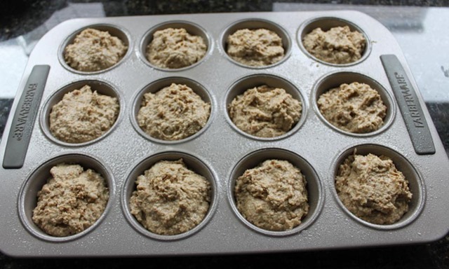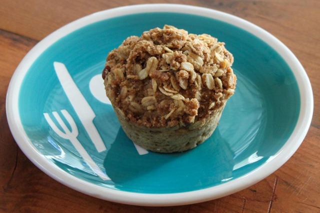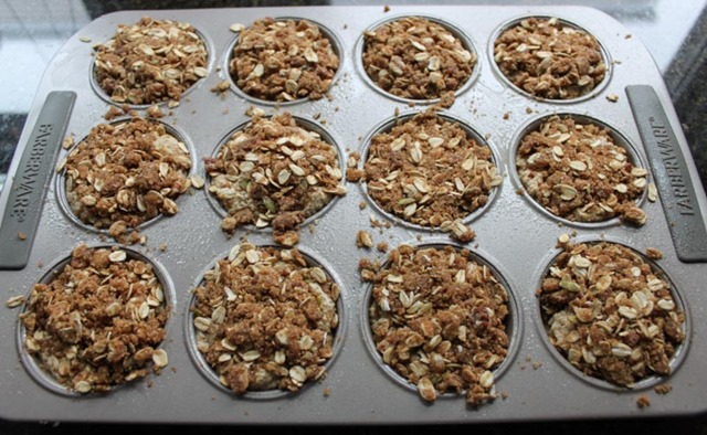 Spray a muffin tin with non-stick spray and spoon in the muffin batter. Finally, load on the crumble topping! I like to press the topping into the batter to make sure it sticks on there really well.