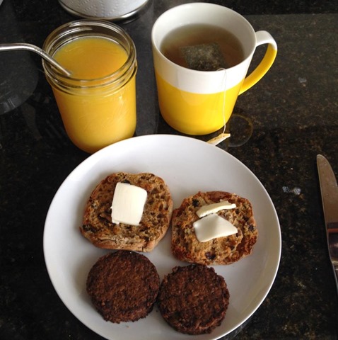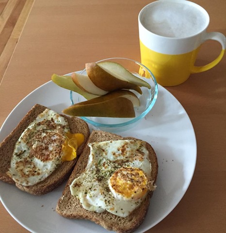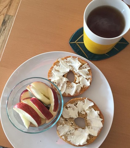 When I eat breakfast at home I have a little more time to prepare and make something I can’t have at work or on the go. This is usually over easy eggs, an english muffin, or a bagel.