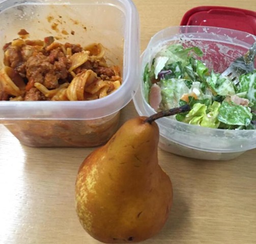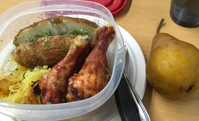 From L to R – 1: brown rice/salad/chicken/tomato/plum, 2: turkey tips/spaghetti squash/salad, 3: baked potato/chicken drumsticks/spaghetti squash/pear, 4: baked potato/carrots/hummus/apple/brie, and 5: quinoa/refried beans/chicken/avocado/hot sauce/tomato.