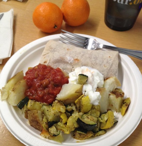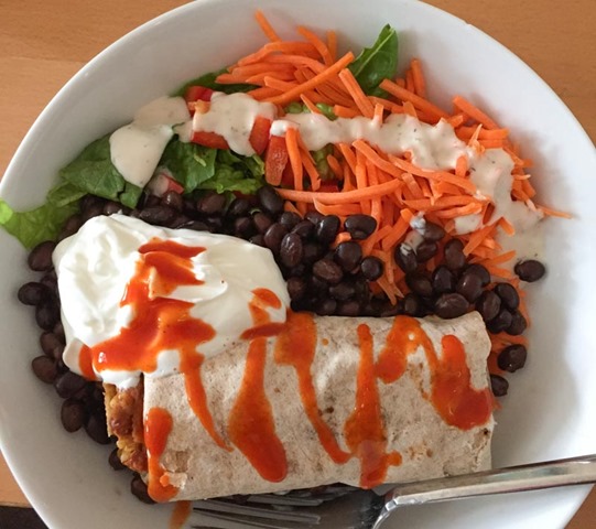 Sometimes when I’m in a bind or pressed for time, I have Whole Foods brand freezer burritos on stand by that I spruce up with fresh veggies, greek yogurt, and hot sauce.