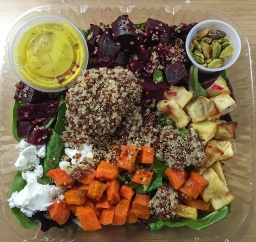 Salads: Another option with countless variations. I will put literally anything and everything in a salad. Here is my go-to salad ingredient list: mixed greens, spinach, avocado, cucumber, bell pepper, banana peppers, peppadew peppers, marinated red onion, beets, carrots, edamame, corn, bacon, chicken, tuna, hardboiled eggs, rice, lentils, quinoa, chickpeas, black beans, almonds, pumpkin seeds, sunflower seeds, goat cheese, and on and on. My favorite salad dressings are balsamic vinaigrette and honey mustard.