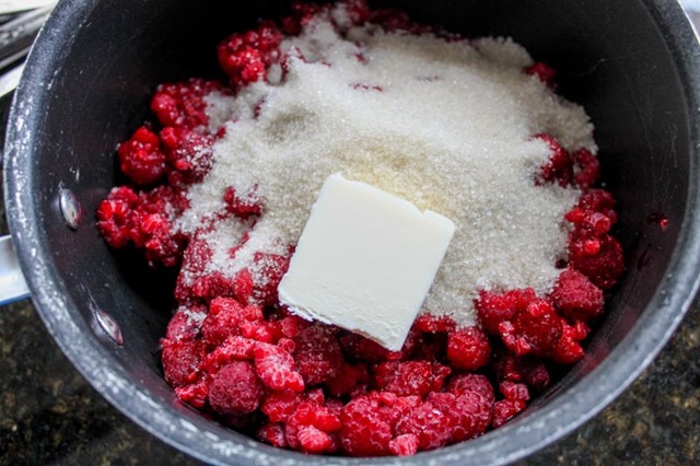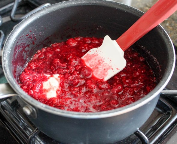 Begin by making the raspberry custard base for the filling. Heat the raspberries, sugar, salt, and butter over medium heat until the sugar is dissolved, butter is melted, and the raspberries have broken down into mostly liquid (5 minutes).