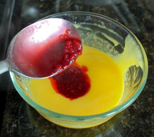When the raspberries are ready, it’s time to temper in the egg/cornstarch mixture. To temper the eggs: Take a spoonful of the hot raspberry mixture and slowly pour it into the bowl of yolks, whisking quickly and constantly. You have to do this slowly or you’ll end up with scrambled eggs.