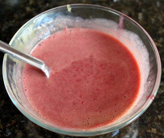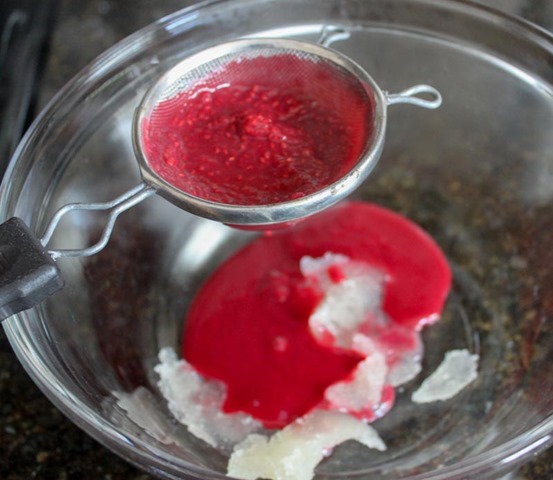 When the custard is done, strain into a bowl with the gelatin mixture in the bottom. A fine mesh strainer works best to strain out all of the raspberry seeds. Stir thoroughly to incorporate in all of the gelatin and set aside to cool to room temperature.