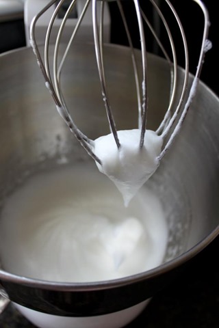 Next, whip the reserved egg whites by hand or in a stand mixer until they form soft peaks.